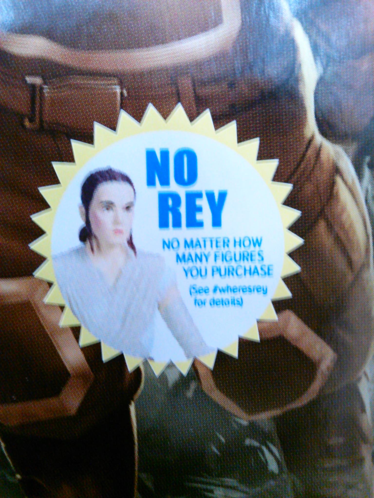 Here is an interesting, if not hilarious, store find. Local collector Phil G. sends in a couple photos from an area Target store (Quarry) that has figures affixed with a custom “No Rey” sticker in the style of the Free Boba Fett sticker from the Vintage Kenner era. This sticker reads: