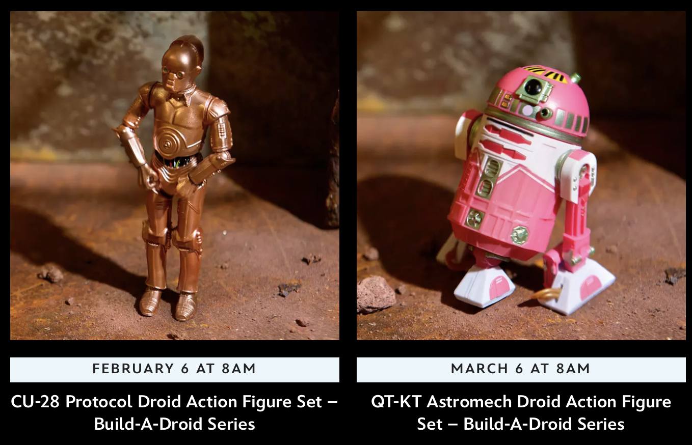 Disney Store has revised the droid name designations for two of the upcoming Droid Factory releases. Originally, the copper protocol droid was named CW-24, now it is CU-28* and the pink astromech was QT-K2, now it’s QT-KT.