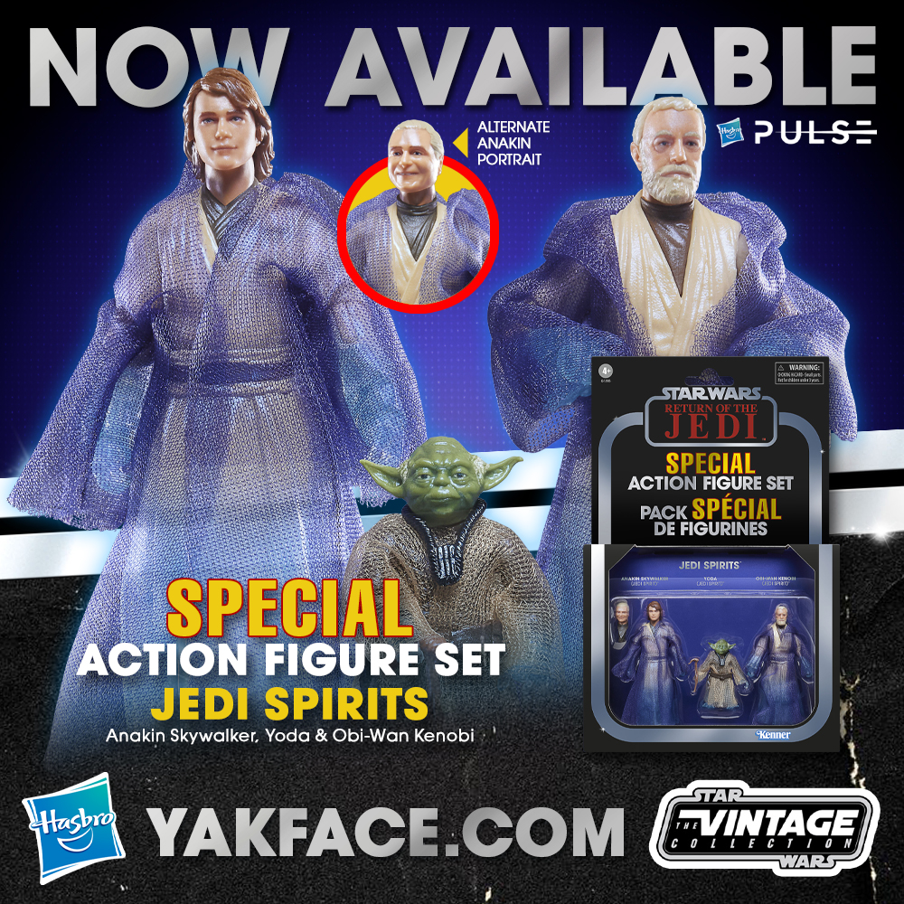STAR WARS: THE VINTAGE COLLECTION JEDI SPIRITS 3-PACK (Ages 4 years and up | Approx. Retail Price: $57.99 Based on Anakin Skywalker (Force Spirit), Yoda (Force Spirit), and Obi-Wan Kenobi (Force Spirit) from STAR WARS: RETURN OF THE JEDI, this 3.75-inch-scale action figure set makes a great addition to any fan’s collection. Features scene-inspired photoreal design and multiple points of articulation, plus soft goods robes. Fans can pose out the figures with Master Yoda’s cane and an interchangeable portrait head for Anakin (a tribute to both actors who played the role!). Inspired by the original line of vintage toys, these collectibles feature premium detail and design across product and packaging that fans have come to know and love (each sold separately, subject to availability).